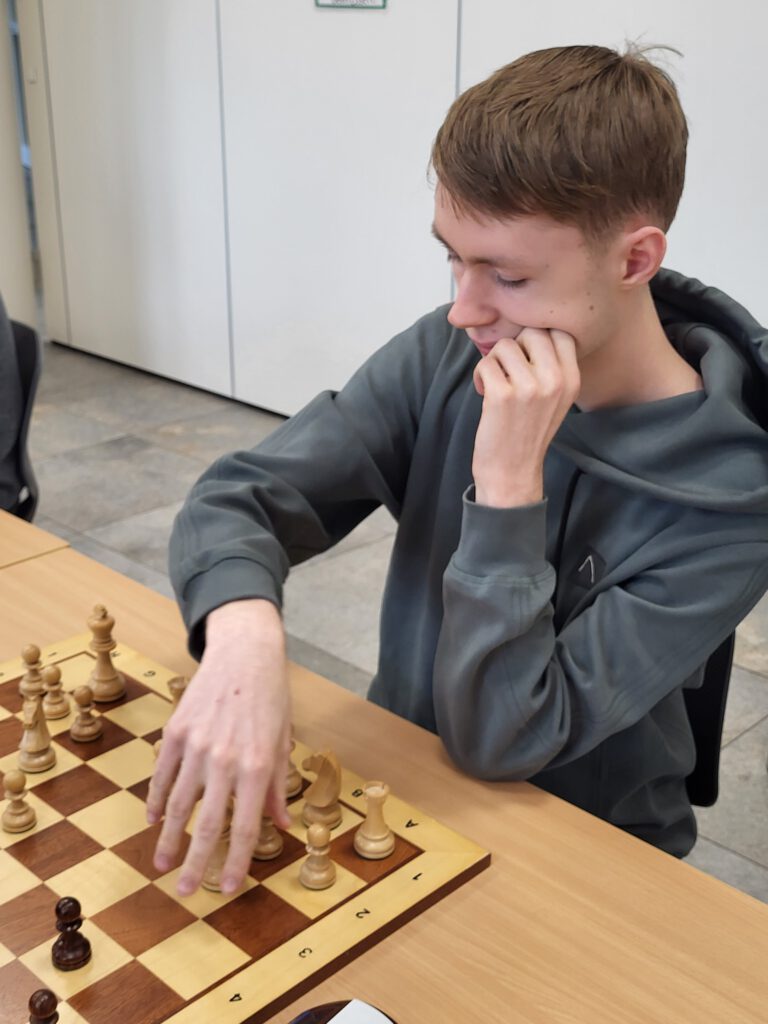 Dann folgte ein kleiner Schock: Alex Koch hatte an Brett 4 eine Leichtfigur gegen gleich 4 gegnerische Bauern geopfert und schien schon kurz vor dem Sieg zu stehen. Doch sein offen stehender König bot dem Gegner immer noch gewisse Chancen zum Gegenschlag. Und leider nutzte der Gegner diese fehlende Deckung. Nach einem Schachgebot seines Gegners konnte Alex ein dreizügiges Matt nicht mehr verhindern und der fast schon sicher eingeplante Punkt löste sich in Luft auf.